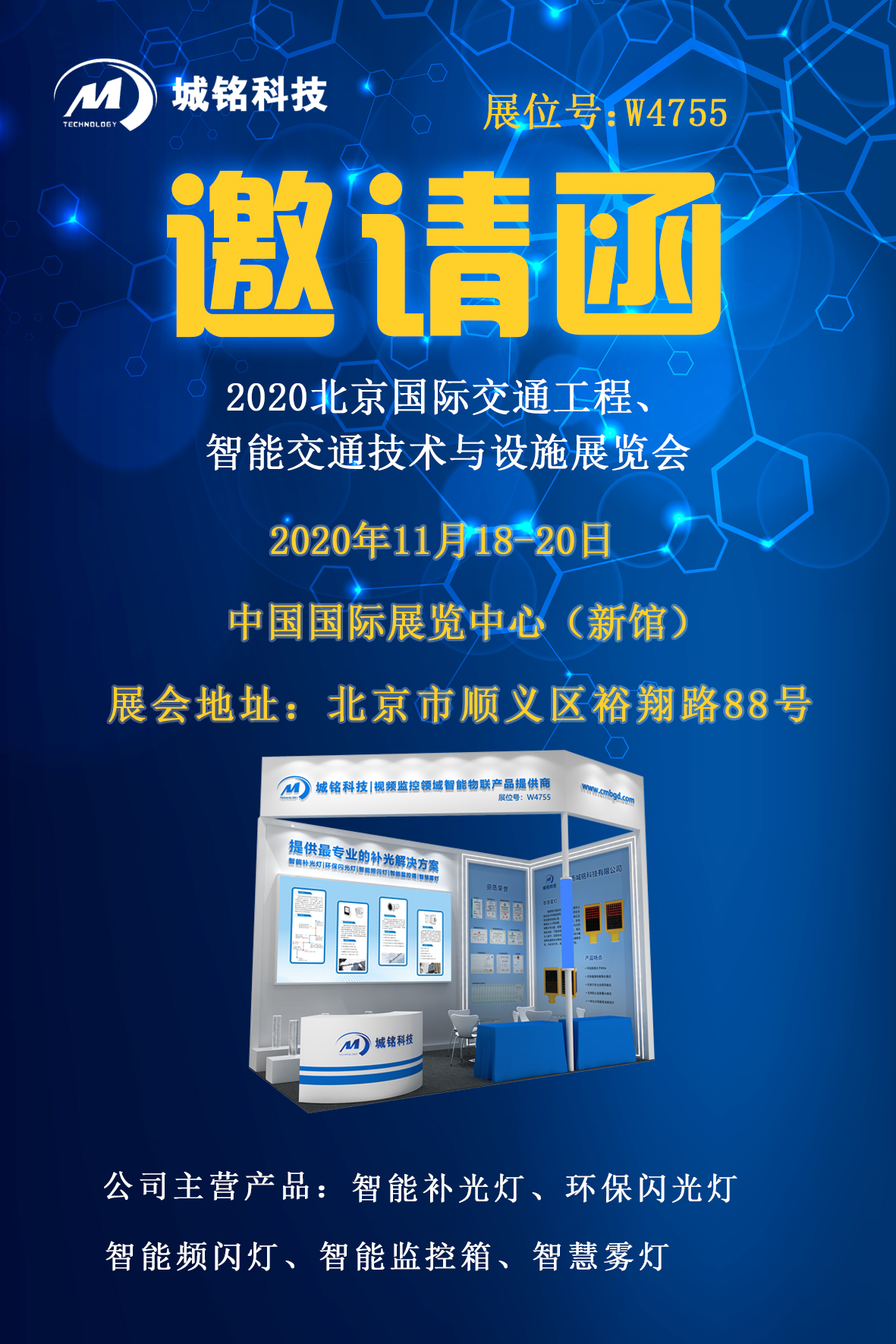 2020北京國際交通工程、智能交通技術與設施展覽會將在中國國際展覽中心(新館)隆重舉辦,本屆展會為期三天,展覽時間:2020年11月18日-20日,城銘科技應邀參展,展位號:W4755,并攜帶:智能運維補光燈、智能交通頻閃燈、環保閃光燈、智能監控箱、智慧霧燈等產品,城銘科技歡迎您蒞臨展會參觀交流。